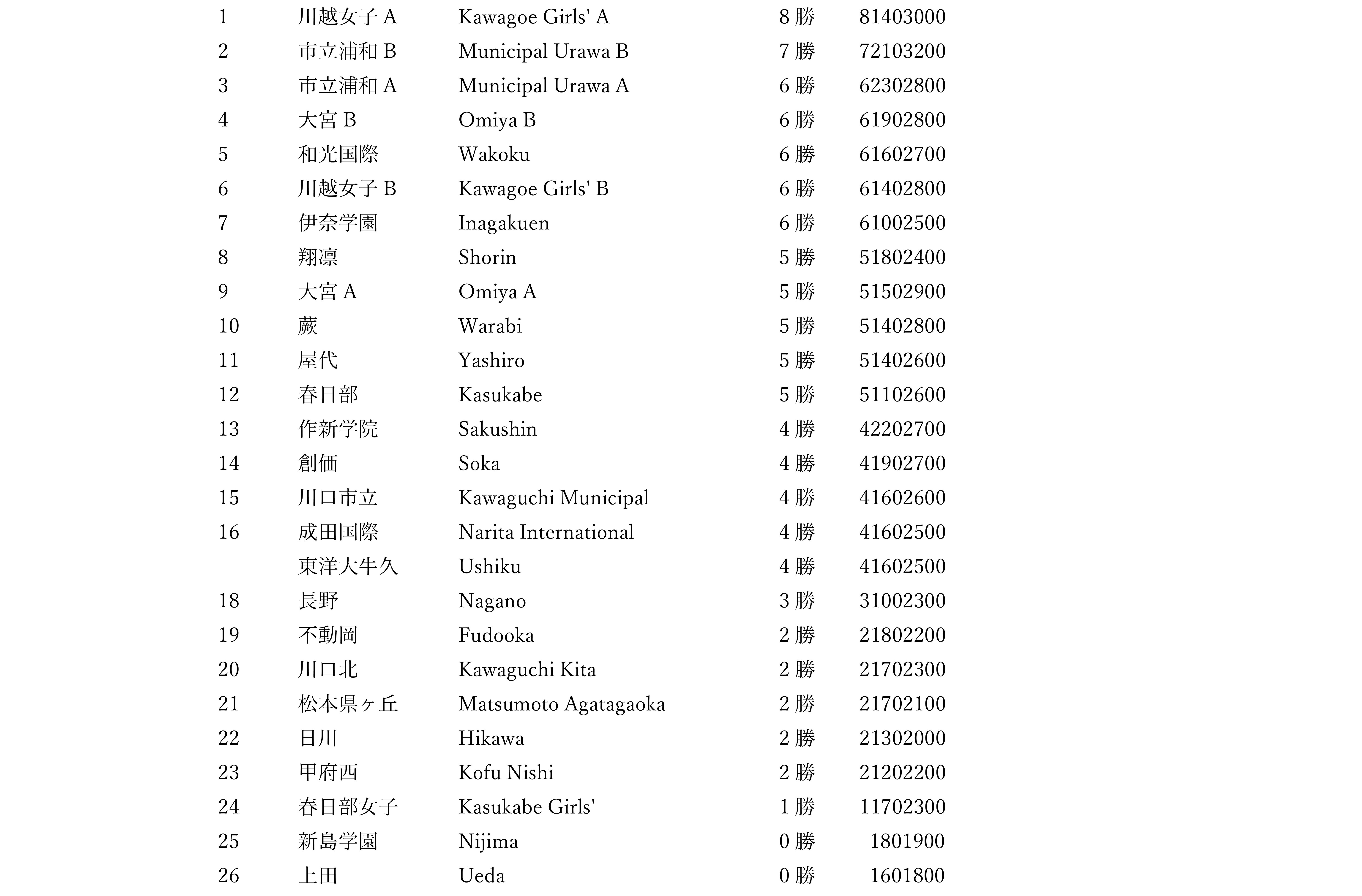 市立浦和高校A、市立浦和高校B、春日部高校、春日部女子高校、川越女子高校A、川越女子高校B、和光国際高校、川口市立高校、大宮高校A、大宮高校B、川口北高校、成田国際高校、東洋大学附属牛久高校、松本県ケ丘高校、新島学園高校、屋代高校、上田高校、作新学院高校、長野高校、山梨県立日川高校、不動岡高校、翔凜高校、甲府西高校、創価高校、伊奈学園総合高校、蕨高校