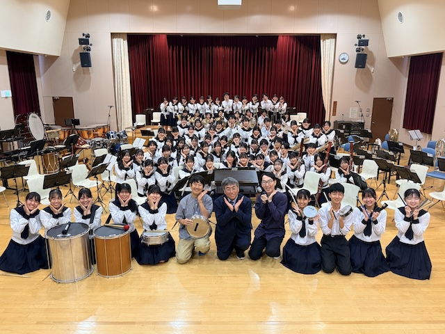 吹奏楽作家のオザワ部長さま、司会にアキラ100%さまにご来校いただきました