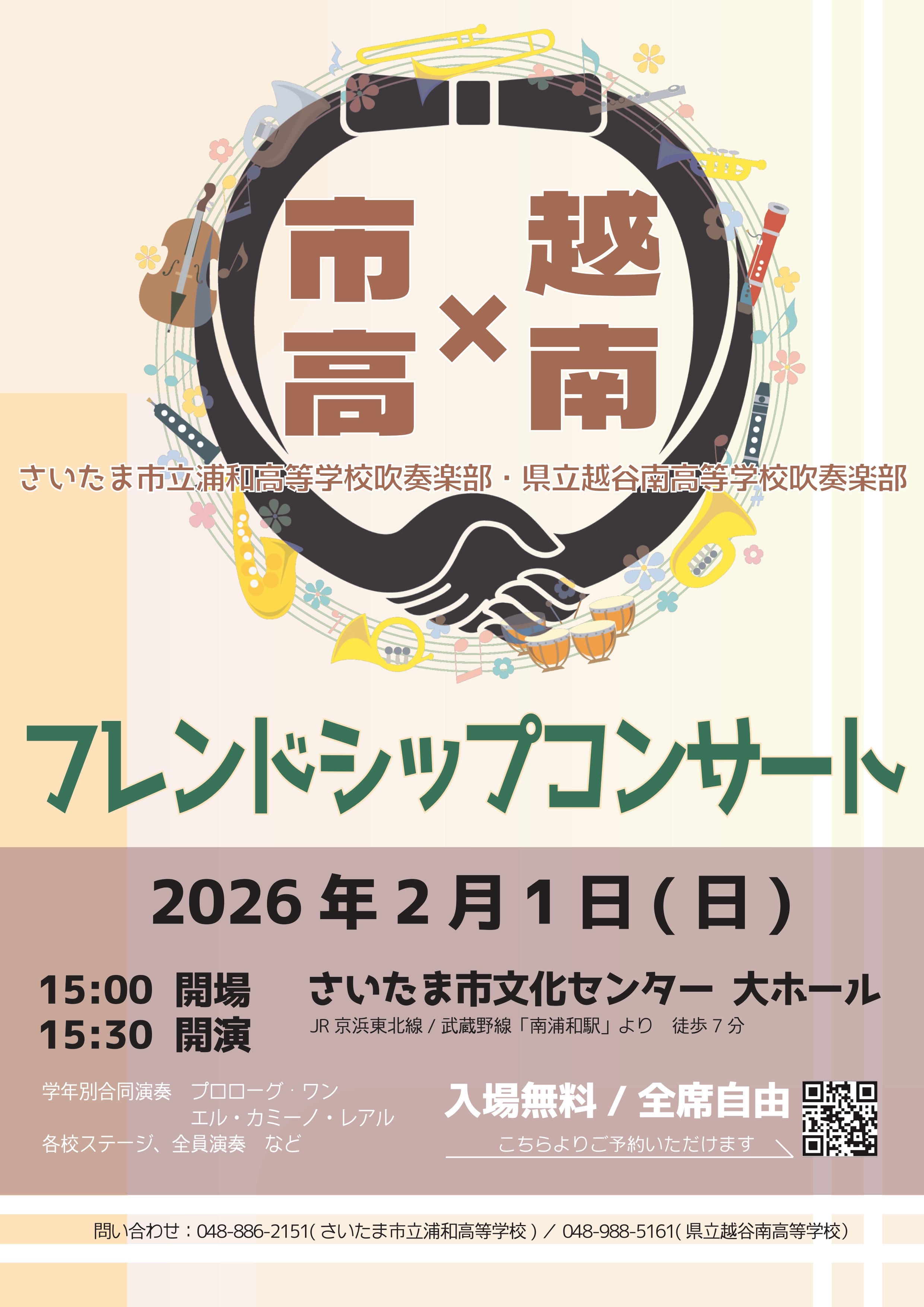 県立越谷南高等学校吹奏楽部の皆さんと、合同開催でフレンドシップ・コンサートを行いました。