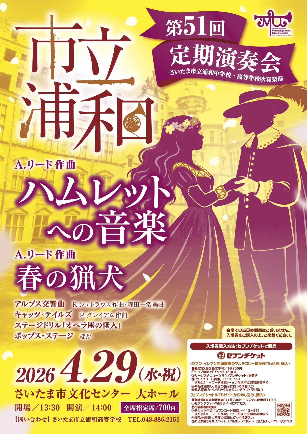 3:チケット申込 「セブンコード検索」→113-991 または「キーワード検索」→さいたま市立浦和高等学校