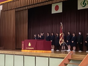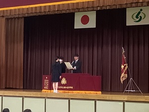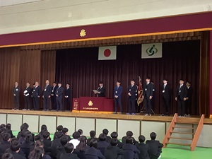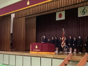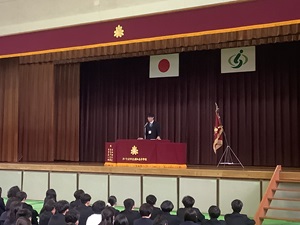 始業式の後は、伝達表彰、続いて吹奏楽部の大会報告、米国姉妹校相互交流事業及び高校生大韓民国海外研修の報告会があり、最後に校歌斉唱しました。