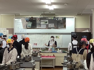 生徒は、調理実習でシンガポール料理をつくりながら、外国の食文化に親しみました。